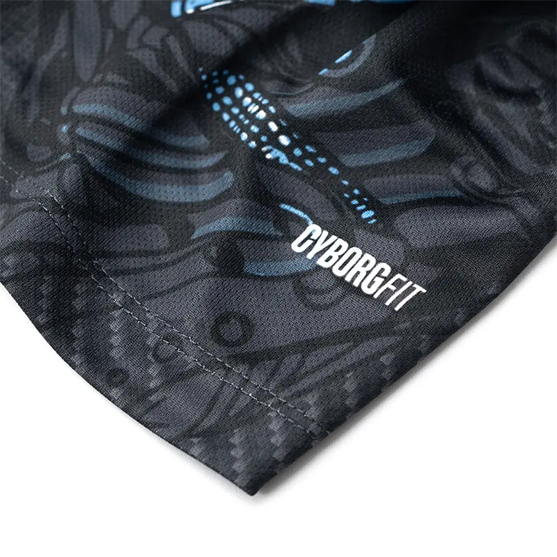 Das Herzstück des Designs ist das Cyborg-Effekt-Muster, eine geometrische, strukturierte Ton-in-Ton-Grafik, die an die metallischen, segmentierten Linien biomechanischer Rüstungen erinnert. Dieses Muster verleiht dem Shirt einen markanten und innovativen Look und symbolisiert Schnelligkeit, Kraft und Kontrolle – Eigenschaften, die den modernen Athleten auszeichnen.