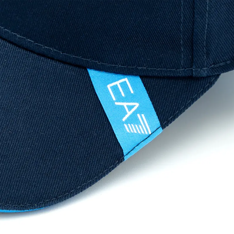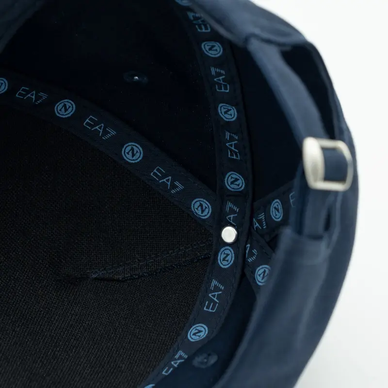 Blaue Campioni d’Italia-Baseballmütze mit einer stilisierten Nummer 4 an der Seite und den offiziellen Logos von SSC Napoli und EA7.