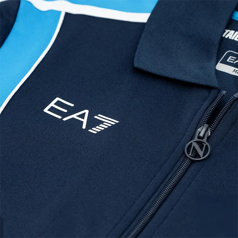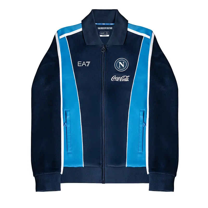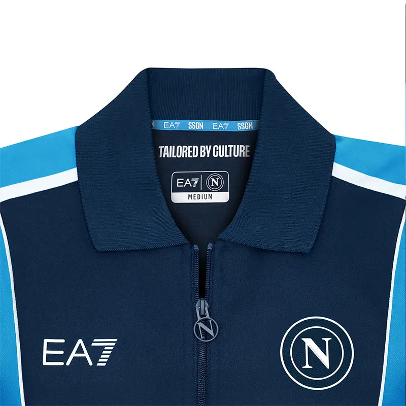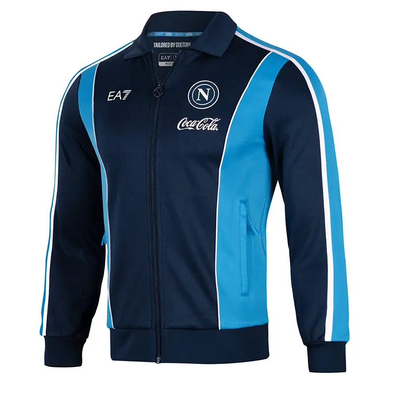 Die dunkelblaue Jacke wird durch hellblaue Streifen verziert, die die Silhouette elegant und dezent betonen. Silikonlogos verleihen ihr eine moderne, minimalistische Note, während der gerippte Baumwollkragen die für neapolitanische Handwerkskunst und Liebe zum Detail typische Handwerkskunst widerspiegelt.
