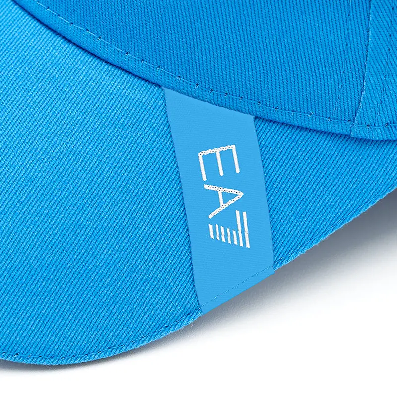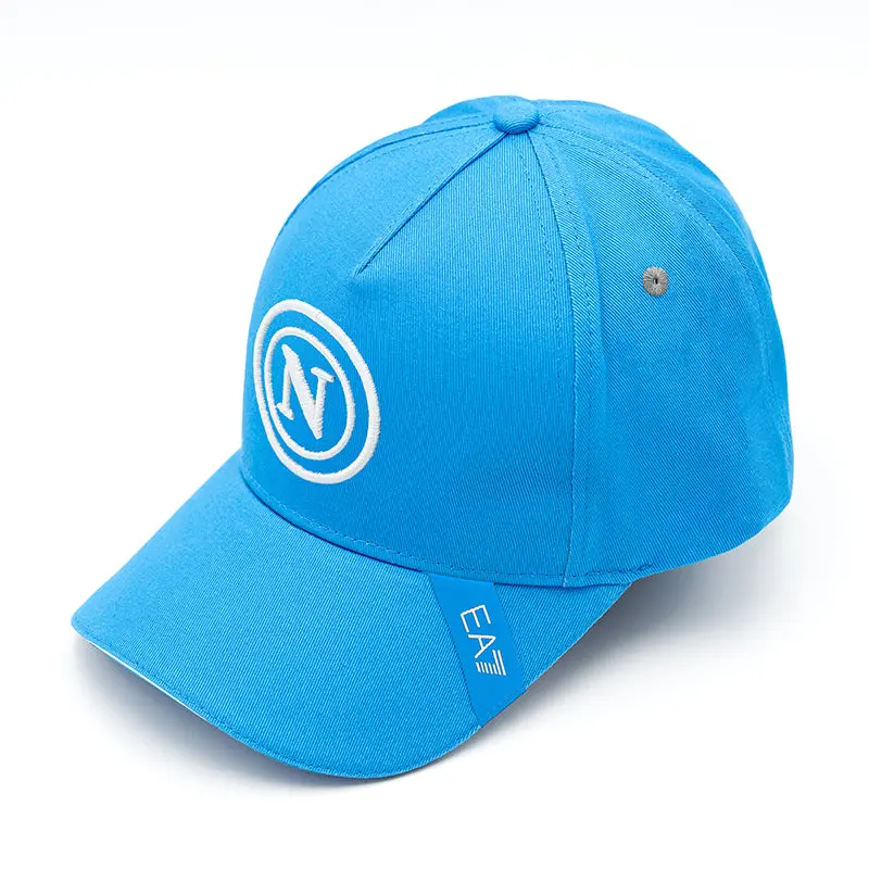 Himmelblaue Mütze mit den Logos von SSC Napoli und EA7.