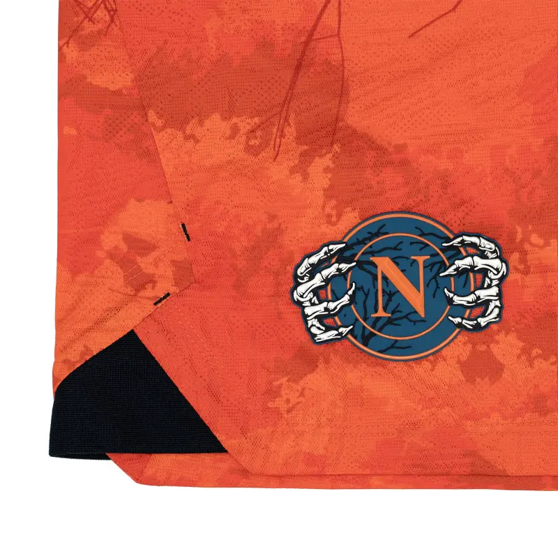 Die orangefarbenen Torwart-Spielshorts des SSC Neapel für Halloween bestechen durch ihr markantes Grafikdesign, inspiriert vom geheimnisvollen Unterholz – einem symbolträchtigen Element der keltisch geprägten Feierlichkeiten.