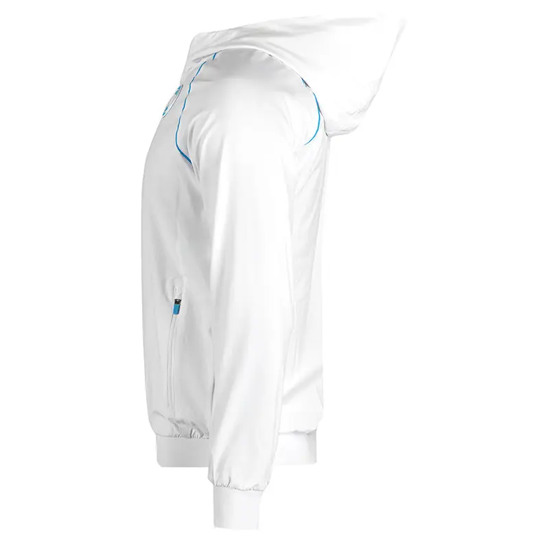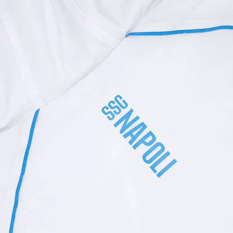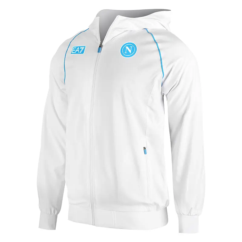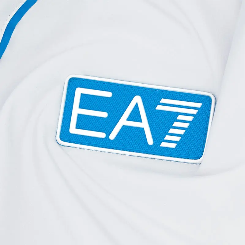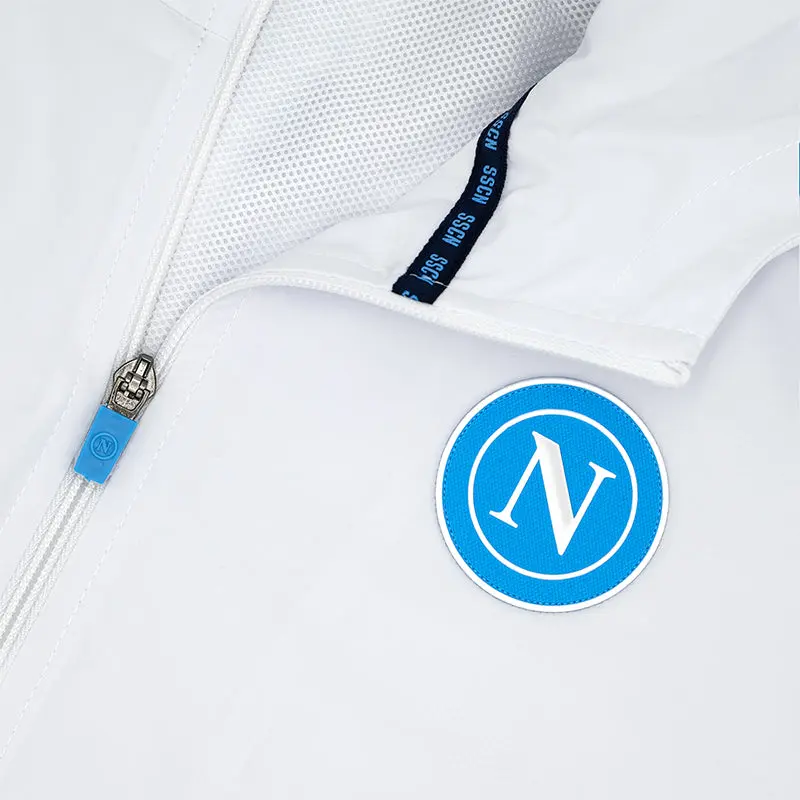 Das weiße Modell verfügt über einen Reißverschluss vorne und ist somit praktisch und bequem zu jeder Gelegenheit zu tragen. Die gestickten SSC Napoli- und EA7-Logos auf der Vorderseite in ikonischem Himmelblau heben sich elegant vom weißen Hintergrund ab und sorgen für einen unverwechselbaren und wiedererkennbaren Look.