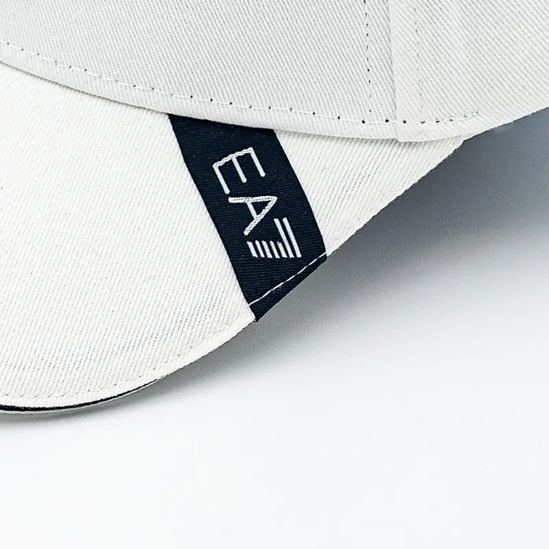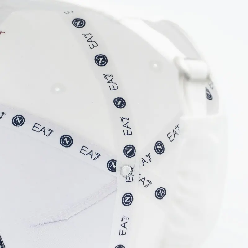 Weiße Campioni d’Italia-Baseballmütze mit einer stilisierten Nummer 4 an der Seite und den offiziellen Logos von SSC Napoli und EA7.