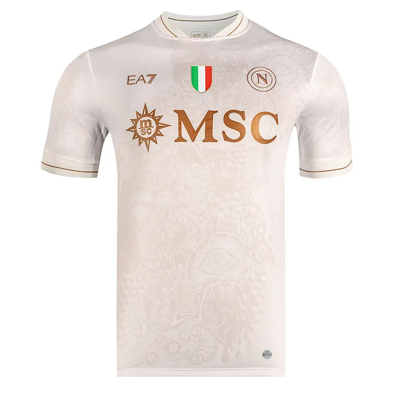 Das Auswärtstrikot „Sand“ 2025/2026 des SSC Neapel ist eine zeitgenössische Hommage an die Seele der Stadt und ist mit dem dreifarbigen Scudetto in der Mitte der Brust verziert, der den in der Saison 2025/2026 gewonnenen Titel des italienischen Meisters symbolisiert.