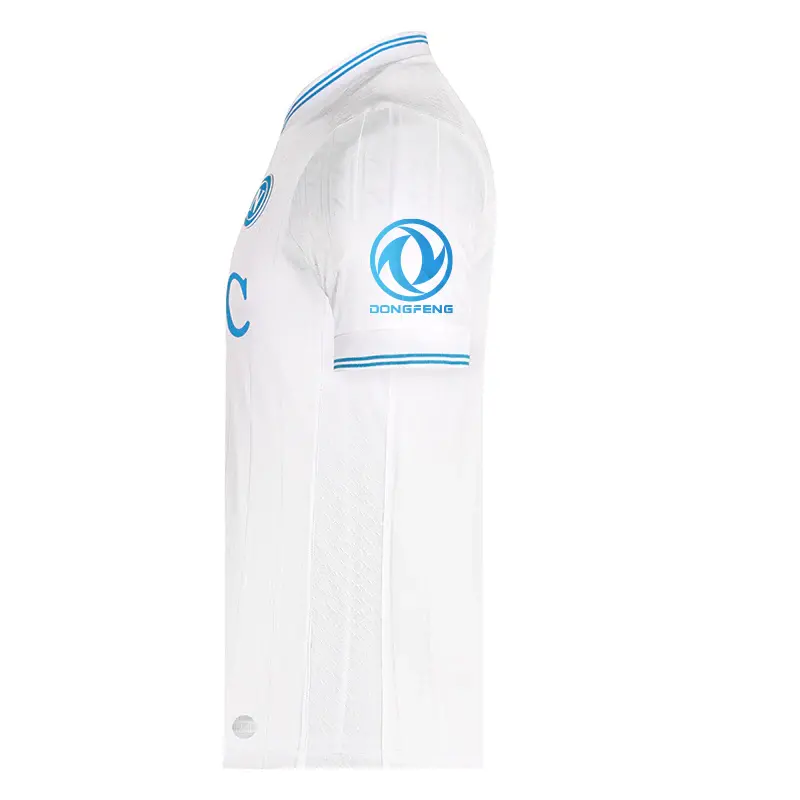 Der V-förmige Kragen ist mit einem himmelblauen Besatz versehen, der den Halsausschnitt elegant umrahmt und die blauen Akzente der Ärmelbündchen aufgreift. Die Ärmel sind eng anliegend und dennoch bequem geschnitten, um die Aerodynamik zu verbessern und Bewegungsfreiheit zu ermöglichen. Auf der Rückseite, direkt unter dem Kragen, prangt stolz die Aufschrift „SSC Napoli“.