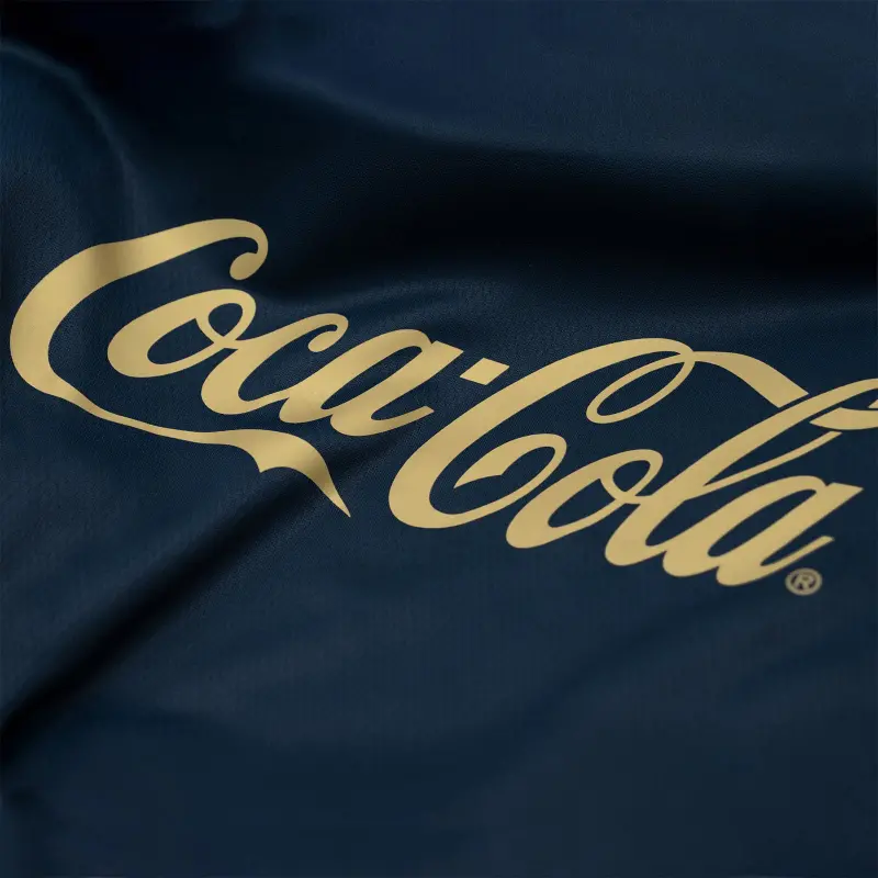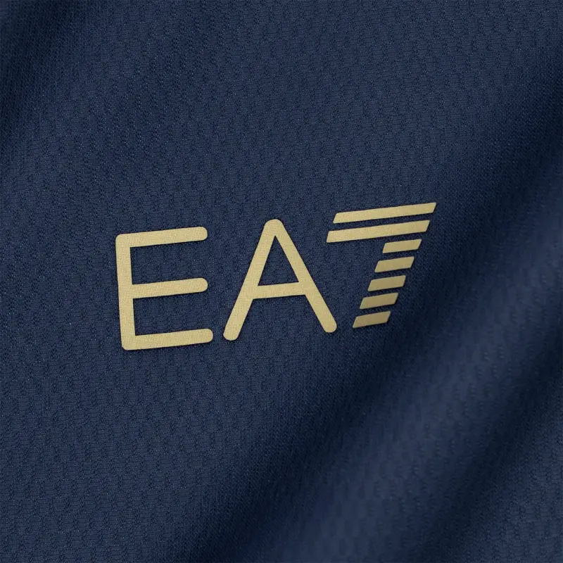 Ein tiefes Blau dominiert die Farbkomposition und verleiht ihr Eleganz und Charakter, während hellblaue Einsätze für Dynamik und Leuchtkraft sorgen. Die goldenen Logos zieren die Vorderseite, bestechen durch subtile Raffinesse und verleihen dem Kleidungsstück eine Aura von Prestige.
