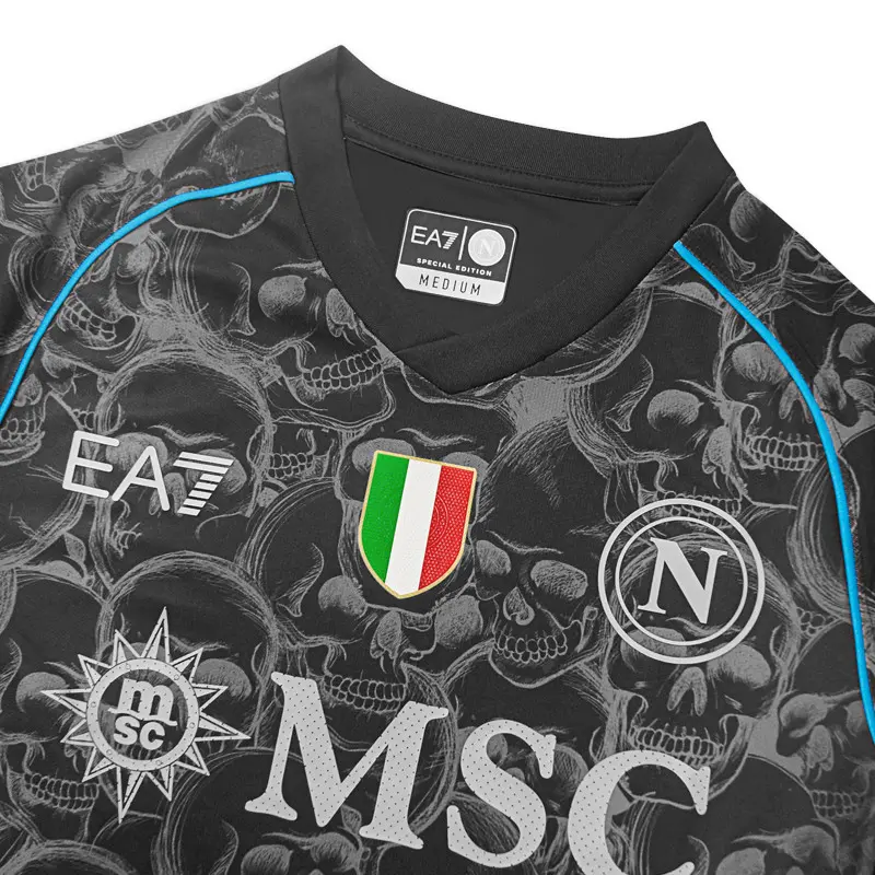 Das EA7/SSCN-Halloween-Shirt zeigt die Skulls Allover-Grafik. Der Digitaldruck erfolgt auf atmungsaktivem technischem Material am Körper und an den Raglanärmeln. Die Paspeldetails sind himmelblau. Die silbernen Relieftransfer-Logos bereichern das Produkt und machen es einzigartig und wertvoll.