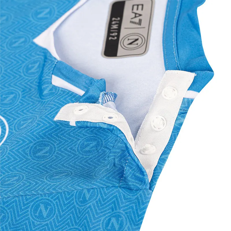 Das Kleinkinder-Heimset ist für die jüngsten Fans des SSC Neapel konzipiert und umfasst das himmelblaue Trikot sowie die weißen Shorts, beide aus Polyester.
