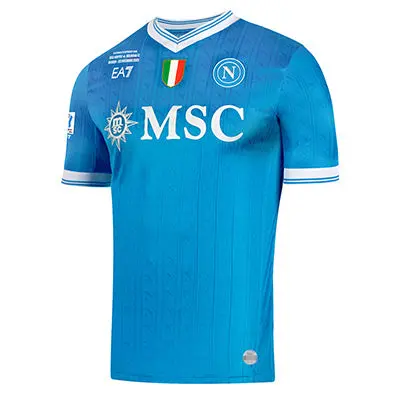 Das Spielshirt besteht zu 90 % aus Polyester und zu 10 % aus Elastan und zeichnet sich durch ein raffiniertes Muster aus, in dessen Gewebe das ikonische neapolitanische „N“ eingearbeitet ist – ein Ausdruck von Identität und Zugehörigkeit.
