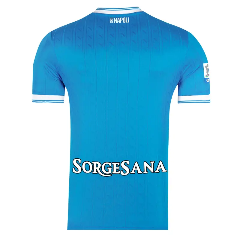Das Spielshirt besteht zu 90 % aus Polyester und zu 10 % aus Elastan und zeichnet sich durch ein raffiniertes Muster aus, in dessen Gewebe das ikonische neapolitanische „N“ eingearbeitet ist – ein Ausdruck von Identität und Zugehörigkeit.