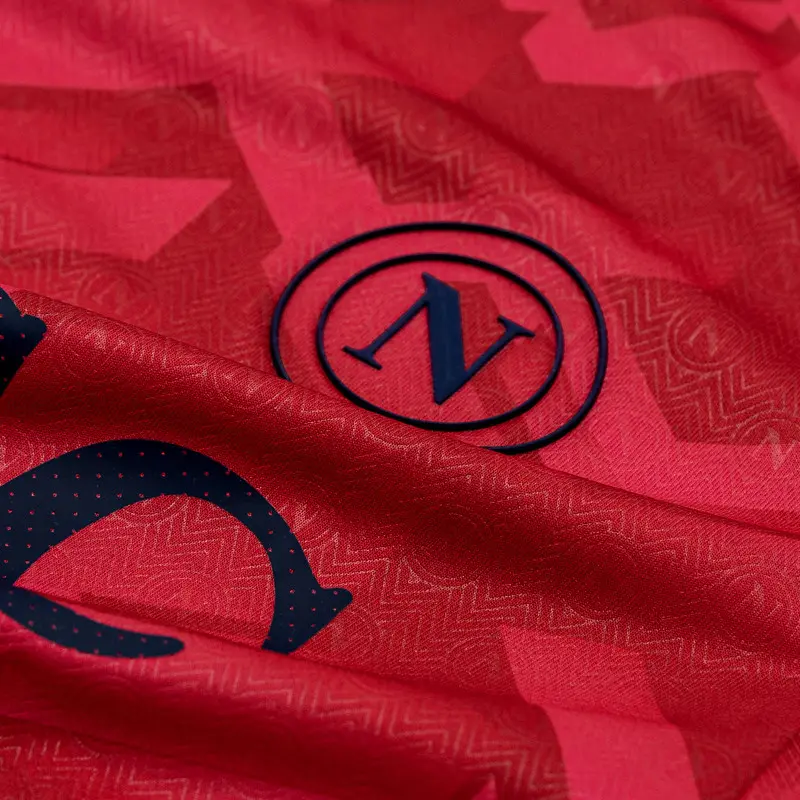 Eine der wichtigsten Neuerungen ist der verkleinerte SSC Napoli-Logoaufnäher mit 3D-Effekt. Dieses Detail verleiht dem Trikot nicht nur eine visuelle Dimension, sondern unterstreicht auch die Aufmerksamkeit des Vereins für die neuesten Designtrends und die Qualität der Details. Der neue SSC Napoli-Schriftzug weist moderne und dynamische Zeichen auf und sorgt für ein zeitgemäßeres und ansprechenderes Aussehen.
